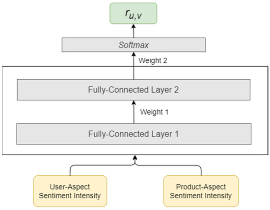 As aspect sentiment intensity is purely numerical, to combine it with other feature vectors, this study adopted an artificial neural network to convert the numerical values of aspect sentiment intensity into feature vectors. Based on the study of Zhang et al. [43], an artificial neural network was employed by this research to build a rating prediction model, as shown in Figure 2. This artificial neural network architecture consists of one input layer, two fully connected layers, and one output layer. The input layer is the user-product aspect sentiment intensity. The fully connected layer is used to concatenate the user’s sentiment intensity characteristics for the product. The output layer uses a Softmax function to classify the output into five categories, which represent the predicted ratings of the reviews (5-star rating). Finally, the user and product weights are extracted from the model to convert aspect sentiment intensity into an aspect sentiment vector with a fixed dimension.