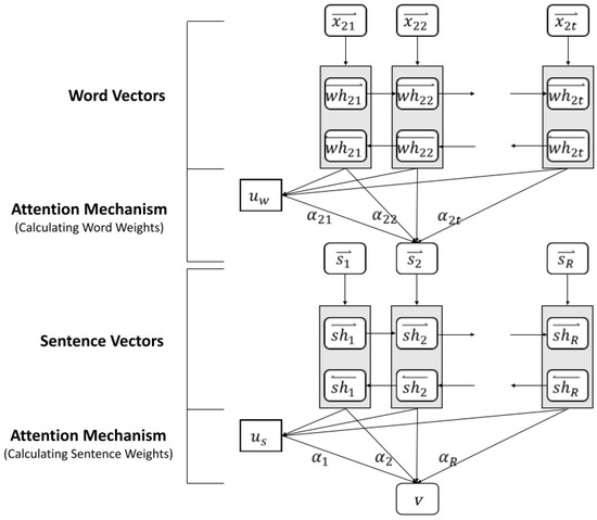 In product reviews, users express their sentiments, feelings, preferences, etc., in words. To explore the implicit content of user-product reviews, many studies have used the attention mechanism to analyze the semantic features in sentences [9,15,44]. There is a hierarchical relationship between the words and sentences of a review. Multiple words form a sentence, and multiple sentences can be organized into one review. Based on the hierarchical relationships in the text, this study used a hierarchical attention neural network [15] to analyze the semantic meanings in reviews.
