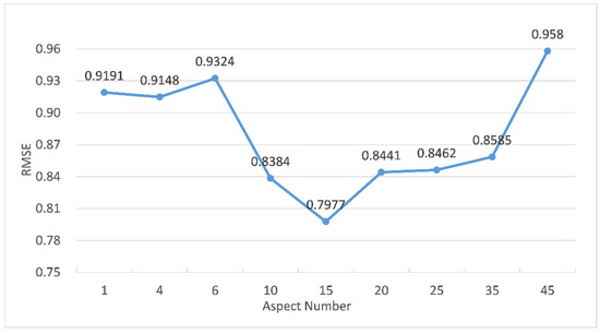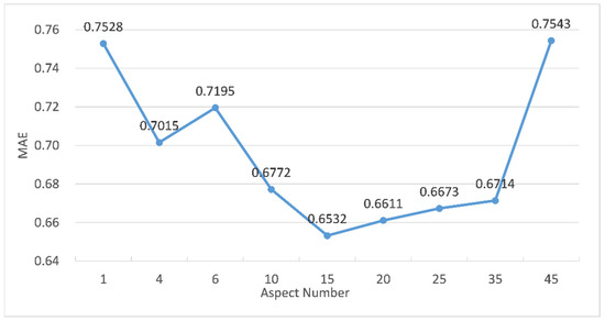 To conduct the experiment evaluation, 75% of the dataset was employed as a training set to train the feature vectors of the users and products, and then build a rating prediction model. In total, 5% of the dataset was used as a validation set to train the parameters of the proposed methods. The remaining 25% of the dataset was used as a testing set to verify the accuracy of the rating predictions. In data pre-processing, text pre-processing, such as word breaking, sentence breaking, useless word removal, punctuation removal, and stemming are performed in review articles. In aspect detection, we set each aspect as containing 30 feature words. The feature word vector is a pre-trained GloVe word vector [30] with 50 dimensions. In addition, the dimensionality of the aspect sentiment vector and aspect semantic vector were both set as 50 dimensions.