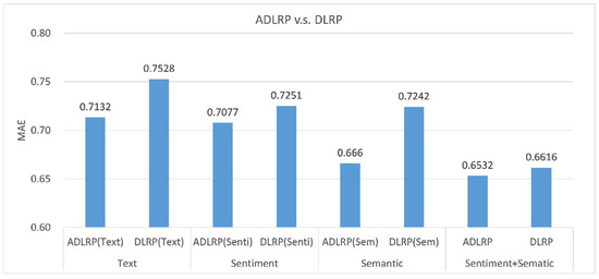 According to Figure 6, ADLRP (Text) only considers aspect features, and its rating prediction accuracy is the lowest. The prediction results of ADLRP (Sem) are better than those of ADLRP (Senti), which represents that aspect semantic features have a greater influence on the rating prediction method than aspect sentiment features do. The ADLRP method, which considers aspect, sentiment, and semantic features, helps to improve prediction accuracy.