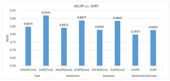 This experiment explored the effects of aspect, sentiment, and semantic features on the rating prediction method (i.e., ADLRP method), and then compared the results of MAE and RMSE. Based on the experimental results in Section 4.3.2, the number of aspects for the ADLRP method was set as 15. The ADLRP method was the basis for comparing the following four features.