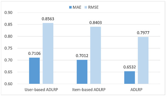 According to Figure 9, we can see that user-based ADLRP has the lowest prediction accuracy, followed by item-based ADLRP; the ADLRP method has the best prediction accuracy. By considering the features extracted from both user and product reviews during predicting rating, we can obtain more accurate user preferences and product ratings, and significantly improve prediction accuracy.