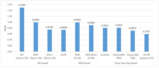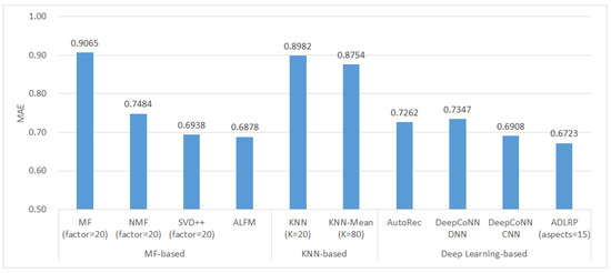 The description of each method is described in Section 4.3.1. In the matrix factorization methods, the number of implied factors of the three MF-related methods was set in the range of 20 to 100, in increments of 10. The results show that the optimal number of implied factors is 20 for all of MF, NMF, and SVD++. In the nearest neighbor methods, the neighbor number K of the KNN and KNN-Mean methods was set in the range of 20 to 100, in increments of 10 in each experiment. The number of neighbors with the best prediction result was selected as the best parameter. According to the experimental results, the best K was 20 for KNN and 80 for KNN-Mean. In the deep learning method, the parameters of the AutoRec method were set as follows: the number of neurons: 500, optimizer: Adam, and learning rate: 0.001. Both DeepCoNN-DNN and DeepCoNN-CNN use GloVe to convert reviews into word vectors. DeepCoNN-DNN consists of three hidden layers and two fully connected layers, with 200 neurons in each hidden layer, Adam as the optimizer, and MSE as the loss function. DeepCoNN-CNN has 2 filters, a convolutional kernel size of 10, and 6 strides, with tanH and ReLu being the activation functions in the convolutional and fully connected layers, respectively, Adam being the optimizer, and MSE being the loss function. The parameters of the ADLRP method, as proposed in this study, are described in Section 4.3.2. In this experiment, the best parameters of each method were selected to compare the rating prediction results, as shown in Figure 10 and Figure 11.