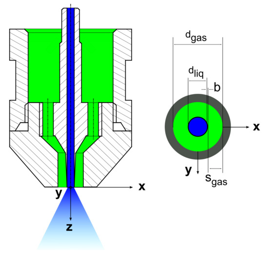 The principle must be applied as follows: (i) using Equation (9), the applied liquid mass flow, requested droplet size, and necessary gas momentum flow can all be calculated; (ii) must be specified as process condition and gas mass flow calculation; (iii) as the liquid velocity remained constant in the investigation, the liquid tube diameter can be determined; and (iv) with the definition of the gas mass and momentum flows, the gas velocity and gas gap width are provided.