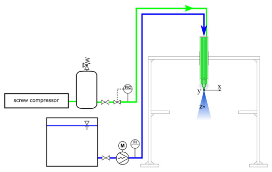 The nozzle was mounted on a twin-fluid lance, that was supplied with liquids from a storage tank. The liquid mass flow was adjusted by a Coriolis mass flow and density meter and pumped through an eccentric screw pump with a mass flow range of = 400–1300 kg·h. Pressurized gas was provided by a screw compressor with a 5 m pressure vessel at = 11 bar. The measurement and regulation of the gas mass flow ( = 50–400 kg·h) was performed by a hot wire anemometer with a coupled valve.