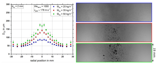 Figure 3 depicts the effect of an increase in the liquid mass flow on the resulting droplet size as a radial distribution (left) and high-speed camera images (right) while operating nozzle N1.