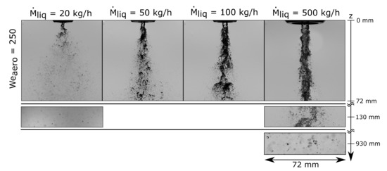 For an illustration of the necessity of liquid mass flow scaling rules, in an initial set of experiments, nozzle N1 (see Table 1) was operated at varying liquid mass flows of kg·h (i.e., = 1.7/3.1/4.4 m·s). The gas mass flow was kept constant at kg·h (i.e., and gas velocity m·s).