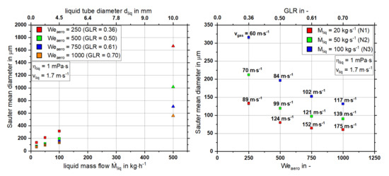 For an increase in liquid mass flow and constant , an increase in the resulting droplet size can be detected. This effect can be explained by a decrease in gas velocity, which leads to lower aerodynamic forces for the atomization of higher liquid mass flows. In contrast to this, an increase in the led to a decrease in the droplet size due to the higher aerodynamic forces available for atomization and increased . As presented in Figure 5 (right), with increasing , the effect of on droplet size is significantly decreased. Solely keeping and constant for liquid mass flow scaling is not sufficient to achieve a constant resulting droplet size. However, to obtain constant droplet size of m, such as between kg·h and kg·h, must be increased by a factor of four, whereas gas velocity needs an increase of about 30%. As previous studies of the authors focused on the gas momentum flow to achieve a scaling principle for system pressure [27], in the following section, the measurements are plotted over this parameter.