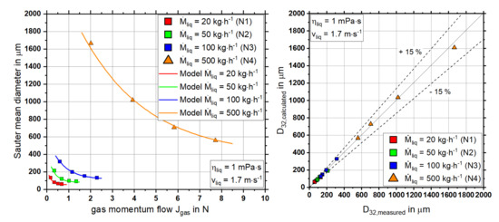 The parity plot in Figure 6 (right) depicts the accuracy of the model, as the measured and calculated droplet sizes are compared. For all measurement conditions, good agreement between the measured and calculated values was achieved. The maximum percentage deviation with 13.2% (m) was observed at kg·h and . In contrast, the maximum deviation in absolute droplet size was m (3.3%) at kg·h and .
