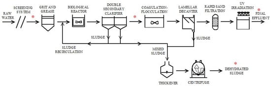 Scheme of WWTP analysed in this work (asterisks indicate sampling points).