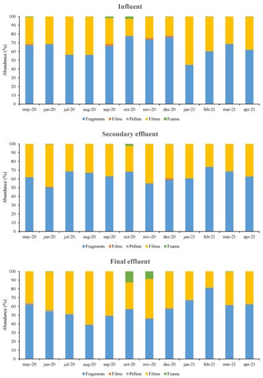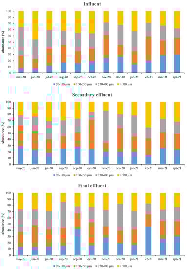 As explained before, the sampling procedure allowed the MP classification by size. According to Figure 3, on average, in influent samples MP ≥ 500 µm only accounted around 30% of total MPs, whereas 56% and 80% represented MPs higher than 250 μm and 100 µm, respectively. This indicates a major percentage of small MPs than usual in the influent since most WWTPs it has been reported MPs abundance with a size greater than 500 µm above 70% [,,,,,]. The variations in the percentages of MPs found in each range of size are noticeable thorough the treatment processes, i.e., the percentage of those MPs with a size greater than 500 µm decreased from 30% in the influent to 24% in the secondary effluent. At the same time, the percentage of the smallest particles (20–100 µm) increased from 20% in the influent to 23% in the secondary effluent. It should be noted that, after pre-treatment and secondary treatment, the MPs most easily eliminated were those larger than 500 μm (57%) and those with a size between 250–500 μm (52%), as can be seen in Table S2. This means that the grit and grease system and the secondary treatment removed the bigger MPs with higher efficiency than the smaller ones. Important variations in the percentages of the middle sizes were not detected and the sizes distribution in the final effluent is similar to the secondary one. In the final effluent samples, the vast majority of MPs were smaller than 500 µm, around 76%, whereas a quarter of the microplastics were smaller than 100 µm (Table S2). These results agree with other previous studies, which reported that most of the MPs in the final effluent were smaller than 500 µm. However, the percentage of MPs smaller than 100 µm in the effluents is usually over 60%, percentage higher than those found in this work [,,,,,,,,]. Table S2 shows that, after tertiary treatment, the most easily eliminated MPs were, both, those larger than 500 μm and those with a size between 100–250 μm (approximately 30%). In addition, considering the temperature, it can be observed that in the warmest months (May–September) the MPs with a size higher of 250 µm presented abundances of 60–70%, while during those months with lower temperature (November, February–April), it is observed that the MPs with sizes less than 250 µm presented abundances of 60%. It has been reported that MP degradation are determined by the combined effect of different parameters, including temperature. Specifically, Ariza-Tarazona et al. [] concluded that photolysis combined to low temperatures leads to plastic brittleness, which is in accordance with results commented above, since the coldest months showed a greater proportion of MPs smaller than 250 µm. Finally, it can be observed that the overall microplastic removal efficiency was higher in MPs larger than 500 μm (70%) compared to the rest of the sizes.
