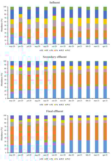 The chemical composition is a relevant characteristic that determines the MP density and therefore, directly influences over the removal efficiency. Over 30 kinds of polymers have been described in wastewater samples of different WWTPs []. In this study PE, PP, PS, PA, PET and polyvinyl chloride (PVC) were detected in the wastewater samples (Figure 6). In the influent, on average, PP is the polymer most frequently detected with an abundance of 24.9 ± 5.5% (ranges between 15.8–37.4%), followed by PET with 23.2 ± 2.9% (27.8–18.1%), PE with 17.3 ± 4.2% (13.0–26.0%), PS with 14.5 ± 2.7% (10.4–17.3%), PA with 3.9 ± 3.4% (9.3–22.4%) and PVC with 6.2 ± 3.1% (1.5–10.7%). Different studies reported that most frequent polymers in urban wastewaters are PS (20–90%), PE (5–60%), PP (2–40%), PET (3–38%), PA (2–35%) [,,] and PVC in low abundances []. These data are in agreement with those found here, excepting for PS that was detected in percentages lower than values described in previous works. These variations in the abundance of different type of polymers in the influent are determined by the origin of wastewater that arrives to the WWTP (urban, industrial, agricultural) []. As the wastewater stream progresses through the different stages of WWTP, polymers less dense than wastewater, such as PP and PE, increased their proportion, being in the final effluent in percentages around 47.4 ± 3.6% and 29.6 ± 5.0%, respectively. On the contrary, polymers denser than wastewater, such as PS, PA, PET and PVC, decreased in abundance during the treatment processes due to their facility of settling, so they represented in the final effluent around 21%, whereas in the influent their proportion was notably higher (58%). An example of the FTIR spectra for each polymer are shown in Figure S2.