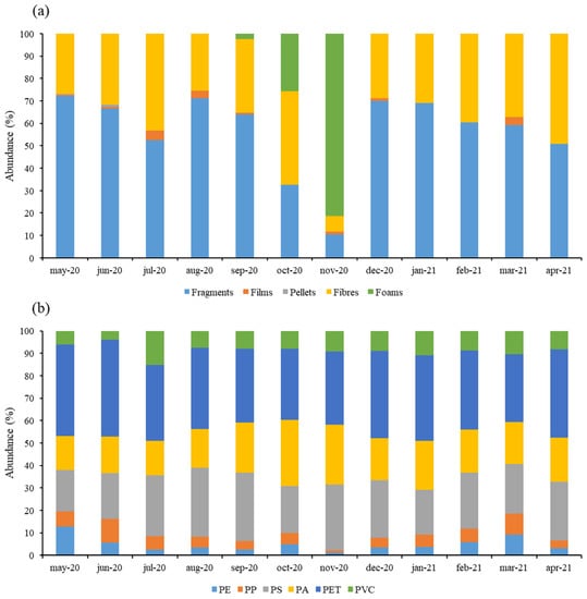 Abundance of microplastics in sludge samples according to (a) the shape and (b) chemical composition.