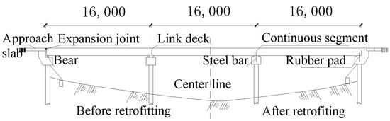 Due to the substructure of the bridge being in good technical condition, it was determined that the strengthening and retrofitting of the bridge is only focused on the superstructure. All the deteriorated simply supported PC voided slabs were replaced by new fabricated PC voided slabs, which were first erected as simple spans and then made continuous by pouring concrete between the adjacent spans, so that no link slabs over the piers were necessary to make adjacent spans continuous again. The slab beams and the abutments were connected together and the expansion joints between them were eliminated in the retrofitted structure. The superstructure was supported on piers and abutments with the semi-fixed dowel joints to form a jointless bridge with semi-integral abutments and semi-integral piers (semi-integral bridge in short). The semi-fixed dowel joint was composed of a rubber pad and a steel dowel with a rubber sleeve, which were also called a pad and dowel bearing. The square rubber pad used in this bridge has a thickness of 40 mm and a side length of 600 mm. The steel dowel had a diameter of 32 mm and a length of 1520 mm, buried in the capping beams for 1000 mm, went through the pad for 40 mm and extended into the slab beam 480 mm. Steel bars were wrapped with a rubber sleeve with an inner diameter of the 32 mm, wall thickness of 40 mm and length of 520 mm. Each slab beam in the transverse direction has two semi-fixed dowel joints with a spacing of 400 mm, as illustrated in Figure 1. The bridge elevation before and after retrofitting is shown in Figure 2. The bridge was retrofitted from July 2014 to November 2014.