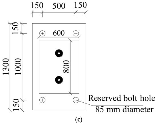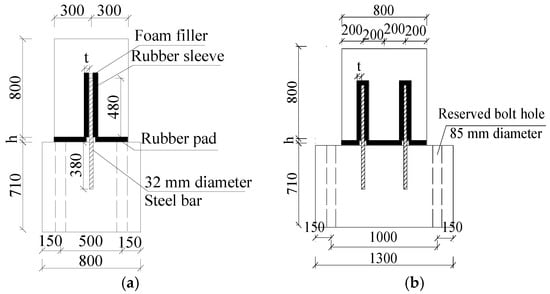 The dimension of the upper concrete block is 800 mm × 600 mm × 800 mm, and the bottom block is 1300 mm × 800 mm × 710 mm for the specimen with a rubber pad thickness of 40 mm; it was 1300 mm × 800 mm × 730 mm when the rubber pad thickness was 20 mm. The specimen dimension is shown in Figure 3.