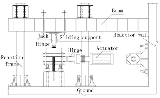 A 100 kN vertical load was applied at the top center of the specimen by means of a vertical hydraulic jack during the whole process of the testing. The horizontal force was applied by means of MTS servo hydraulic loading system, as shown in Figure 4. The test was controlled by displacement.