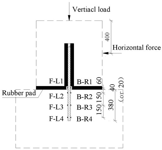 Strain gauges were placed on opposite surfaces of each dowel to monitor bending strains, in which “F” and “B” of the gauge mean in front and back of the loading, as shown in Figure 5. The strain gauges were only arranged in the part buried into the bottom concrete block as well as the part through the rubber pad, but not in the part inside the upper block, because they would be damaged by the relative displacement between the rubber sleeve and the steel dowel during the test. In the strain gauge numbers, ”L” and ”R” represent the left and right sides of the steel dowel.
