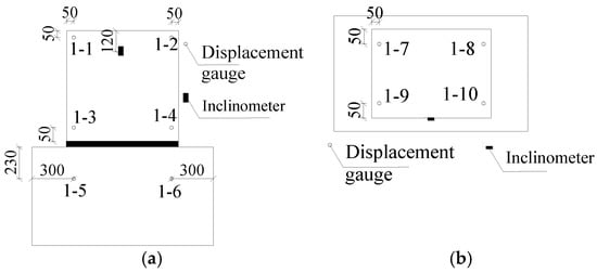Four displacement gauges and one inclinometer were placed along the front of the concrete structure (perpendicular to the loading direction), as shown in Figure 6a, to measure the relative horizontal displacement and inclination angle of the upper concrete block. Two displacement gauges at the bottom concrete block were used to measure its horizontal displacement. Another four displacement gauges were placed on the top surface of the upper concrete block, as shown in Figure 6b, to measure the rotation angle of the joint and the vertical displacements caused by rotation. The vertical displacement measured by these four displacement gauges and the inclination angle obtained from the inclinometer can be used to check each other.