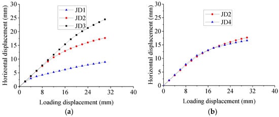 It can be seen from Figure 6 that the horizontal displacement of the joint increases with the increase of loading displacement. The mechanical behaviors of the specimens can be roughly divided into two stages on the curves: elastic stage and plastic stage. As illustrated by Figure 7a, before the loading displacement of JD1, JD2 and JD3 was 6 mm, 10 mm and 16 mm, respectively, the loading displacement–horizontal displacement curve was a straight line, and the rubber sleeve was mainly subjected to radial compression; the specimen worked elastically. After that, the specimens entered the plastic stage with a gentle change of the tangent slope of the loading displacement–horizontal displacement curve, and the deformation of the specimens was mainly the rotation. In the case of the same rubber pad, the upper horizontal displacement of the joint at the second stage increased with the decrease of thickness the rubber sleeve.