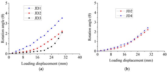 It can be seen from Figure 8a that the rotation angle of the joint increases with the increase of loading displacement, and the curve can also be divided into two sections. The rotation angle of JD1, JD2 and JD3 is in a straight line before the loading displacements of 6 mm, 10 mm and 14 mm, respectively, and in a rising curve at the later stage. The rotation angle decreases significantly with the decrease of the wall thickness of rubber sleeve. The reason is that the larger radial compression deformation of the thicker rubber sleeve dominates the deformation of the joint.