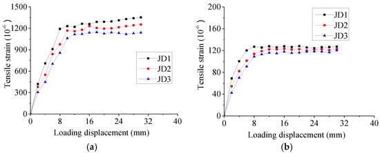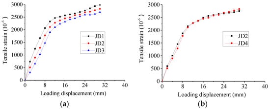 By comparing the influences of different thicknesses of rubber sleeves in Figure 9a, it can be seen that the strain of steel bar increased with the decrease of the wall thickness of the rubber sleeve. The reason is that, the smaller the wall thickness of rubber sleeve, the larger the rotation angle and flexural-tensile strain of the steel bar. By comparing JD2 and JD4 with different thicknesses of rubber pads in Figure 9b, it can be seen that the two curves are almost the same, indicating that the thickness of the rubber pad has little influence on the stiffness of the steel bar within the range of test parameters, which can be ignored.