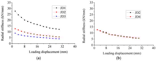 Figure 13a gives the curves of loading displacement–radial stiffness of specimens JD1, JD2 and JD3 with the wall thickness of the rubber sleeve as the parameter. The radial stiffness of the specimens decreased greatly before the loading displacement of 16 mm, and then gently decreased, and the curves were approximately straight lines. The radial stiffness of the joint increases with the decrease of the wall thickness of rubber sleeve. The maximum radial stiffness of JD1, JD2 and JD3 are 27.7 kN/mm, 12.6 kN/mm and 8.4 kN/mm, respectively.