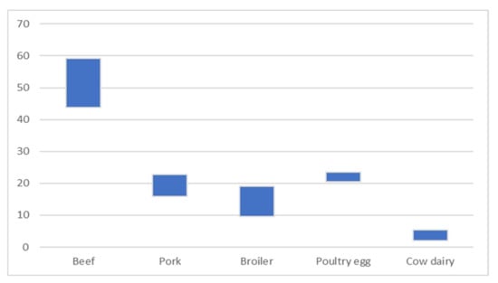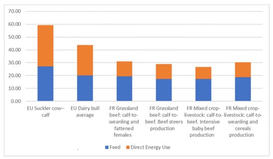 According to Nguyen et al. (2010), it has been estimated that around half of all EU beef production comes from culled dairy cows and that the other half comes from systems specialized in beef production []. Multiple studies highlight that, compared to the main livestock systems, the production of beef carries the highest environmental load per kilogram of meat produced [,]. Data presented below are from Nguyen et al. (2010), who conducted an LCA on four types of beef production systems in the EU [] and is further complemented by a beef production study by Veysset et al. (2014) []. Nguyen et al. (2010) showed that on average in the EU, 59.2 MJ/kg of beef was required for a suckler cow–calf and 43.73 MJ/kg for a dairy bull (Figure 3 and Table A2).