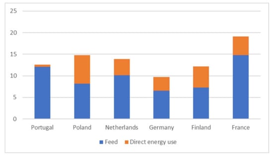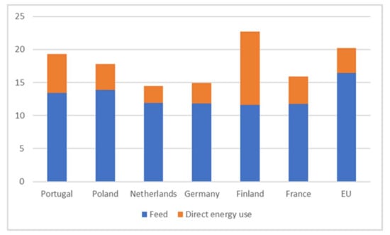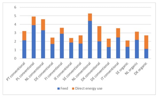 Pig production systems in the EU are generally characterized as intensive [], closed systems where pigs are kept inside animal housing and feed is imported. However, there seem to exist large variations in the size and production focus among the different farms. Nguyen et al. (2012) documented typical intensive pig production systems in the EU, which represent around 70% of the total production in the EU [], while Visser et al. (2012) conducted LCAs on the energy requirements of pork production in six different EU countries []. The figures presented in these studies ranged from 15.9 MJ/kg to 22.7 MJ/kg, and, in most cases, up to 75% was associated with feed (Figure 5 and Table A3).