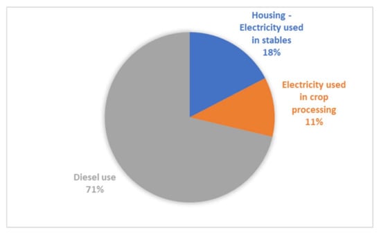 On the other hand, this rough estimate would suggest that 60–70% of energy consumption in beef production systems is associated with on-farm activities. Nguyen et al. (2010) provided a breakdown of direct energy use. His study highlighted that on-farm diesel use accounts for 71% of direct energy use, which can mainly be attributed to manure management and field operations, while on-farm electricity used in stables and housing accounts for 17% and crop processing for 11% of total energy requirements (Figure 4).