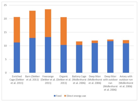 Around 400 million laying hens are kept in the EU, of which, according to Eurostat, 53% are housed in enriched cages, 27% in barns, 15% are free-range, and 5% organic []. These generally range from more intensive to less intensive, respectively, whereby enriched cages are characterized by high stocking densities and closed cages, while in the other systems, hens have lower stocking densities and generally have access to an outdoor space []. There is relatively little information available on chicken egg production in the EU, which makes it difficult to draw conclusions. Dekker et al.’s (2011) study looked at four egg production systems in the Netherlands, which, although geographically limited, covered the main production systems in the EU []. This study found that to produce 1 kg of eggs, 20.5–23.5 MJ of energy inputs were needed and that in all cases, at least 50% of all energy inputs were associated with feed (Figure 7 and Table A5).