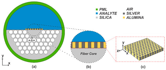 The proposed sensor is schematically depicted in Figure 1. The total diameter of the fiber was D = 24 µm. The PCF cross section was composed of a hexagonal array of air holes in a silica background (Figure 1a). The diameter of the fiber core was 5 µm, and the distance between two adjacent air holes was Λ = 2 µm. The diameter d of each air hole was obtained from the ratio d/Λ = 0.88. The D-shaped structure can be fabricated by the stack-and-draw technique [13]. A metamaterial layer composed of silver nanorods embedded in an alumina matrix was deposited on the flat surface of the fiber. Its total width and thickness were 10 µm and 40 nm, respectively. Figure 1b highlights the metamaterial structure.