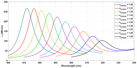 The variation of the refractive index of the analyte changed the SPR wavelength as well as the magnitude of the confinement losses. Figure 3 shows the confinement loss spectra presented by the D-shaped PCF with a metamaterial layer regarding a filling fraction and refractive indexes of the analyte in the range of 1.30–1.39.