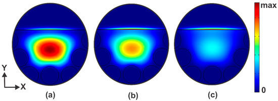 To evaluate the spectral output of the SPR sensor, we carried out numerical modeling of the effective guided modes using the finite element method software COMSOL Multiphysics [22]. The two-dimensional computational domain is given by the cross section of Figure 1a, truncated by a perfectly matched layer (PML) with a thickness of 0.1D (D is the diameter of the D-shaped PCF). The Wave Optics package in the frequency domain was applied to calculate the eigenvalues of the Helmholtz equation in the angular frequency :