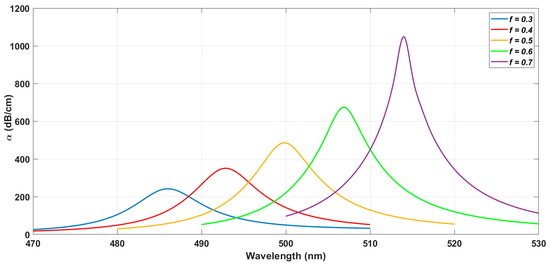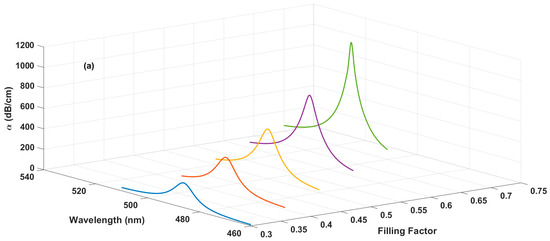 Figure 5 depicts the influence of the metamaterial filling fraction on the amplitude and spectral location of the confinement loss peak regarding a constant refractive index of the analyte, .