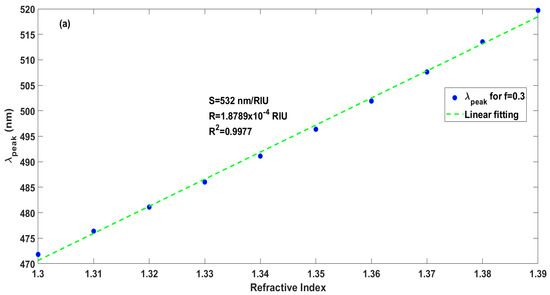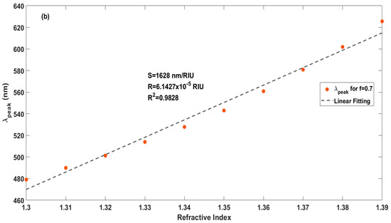 From the spectra shown in Figure 3, the obtained sensitivity and resolution were 532 nm/RIU and 1.8789 × 10−4 RIU, respectively.