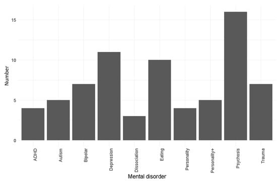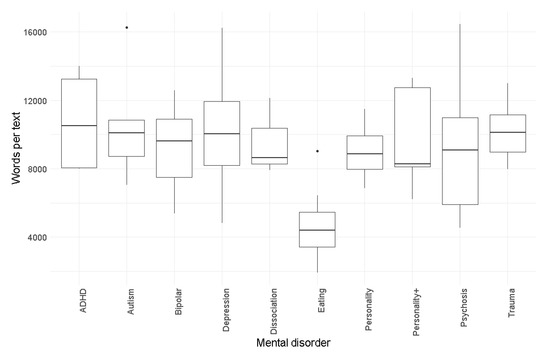 An overview of the number of people per mental disorder in our dataset is shown in Figure 1. The group with dissociation (a disconnection between a person’s memories, feelings, perceptions and sense of self) contains the least number of people in this dataset; the group with psychosis is the largest. Furthermore, there are two labels about personality. Personality includes obsessive-compulsive personality disorder, avoidant personality disorder, dependent personality disorder and unspecified personality disorders. Personality+ in this research only includes borderline personality disorder (BPD). Figure 2 shows a boxplot of the number of words per mental disorder, which indicates that people with eating disorders use less words than people without eating disorders.