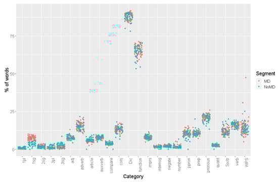 Figure 3 shows the decision tree for the LIWC-output. If an interview transcription consisted of more than 5.4% of the first-person singular pronoun, than it was classified as being of a person with a mental disorder. If not and if less than 8.5% of the words were related to social concepts, then the interview was classified as being of a person with no mental disorder. Furthermore, the decision tree categories of the LIWC tool were visualised in a stripchart (jitter) plot, a fragment of which is shown in Figure 4. In particular, this plot effectively illustrates the potential to identify people with and without a mental disorder based on the empirical frequencies of hypothesised LIWC category occurrences, such as first-person singular pronoun (1sg), further strengthening the rationale behind this feature being the root decision of the LIWC decision tree shown in Figure 3.
