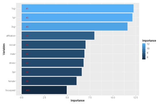 Furthermore, we investigated the LIWC’s feature importance using a random forest classifier to determine which variables added the most value to our binary predictions. Figure 5 shows the top 10 variables that impacted the classification.