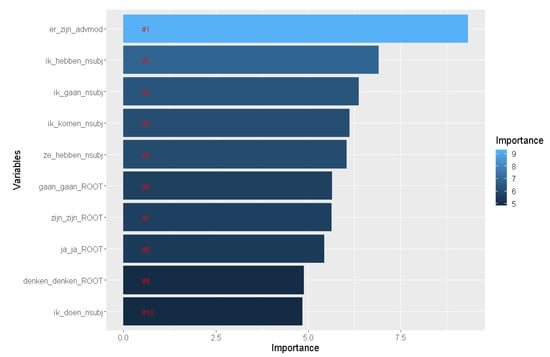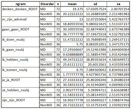 Similarly, we investigated the SpaCy feature importance using a random forest classifier to determine which n-grams added the most value to our binary predictions. Figure 6 shows the top 10 variables that impact the classification. In addition, we present the mean, standard deviation (sd) and standard error (se) for each n-gram in Figure 7. A Mann–Whitney U test revealed no significant difference between people with and without mental disorders in their usage of the following four spaCy variables: denken_denken_ROOT, gaan_gaan_ROOT, ja_ja_ROOT and zijn_zijn_ROOT. Finally, we provide example sentences for each of the identified SpaCy language markers in Table 4.