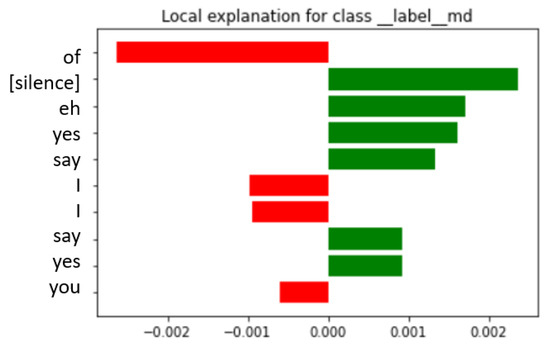 Quote 2 is from someone with an eating disorder and was analysed with fastText. The word “eh” was highlighted because it explained why the transcription was labelled as coming from a patient with a mental disorder (class = _label_md). Figure 9 shows the ten words with the highest probabilities from that transcription.