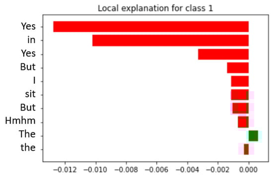 LIME was applied to both fastText and RobBERT to gain further insight into the black-box neural network models. LIME is a well-known and well-understood surrogate model-based approach to help explain model predictions by learning surrogate models using an operation called input perturbation [49]. For each sentence, subsamples of words were generated and fed to the model, so for each word the predictions for subsamples with and without this word could be compared, and subsequently the contribution of this word could be assessed. For example, quote 1 was from someone who had been diagnosed with schizophrenia, and the text was labelled by RobBERT as mental disorder. The word “eh” has been highlighted because it explains according to LIME why it was labelled as mental disorder (class = 0). Note that the original quote is in Dutch, but for convenience we provide English translations here. In addition, “[silence]” means a pause that was judged as meaningful by the transcriber of the interview. In Figure 8, the ten words with the highest usage can be seen. Some words appear multiple times in the figure. This is because LIME looks locally at a text and every word appears in a different context. This also means that sometimes a word will be an explanation for a mental disorder and other times not, especially for context sensitive algorithms like RobBERT.