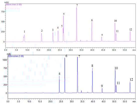 HPLC-DAD chromatogram at 280 nm and 320 nm for the standard (100 mg/L) for gallic acid (peak 1 (8.578 min)), protocatechuic acid (peak 2 (16.6 min)), p-hydroxybenzoic acid (peak 3 (21.8 min)), caffeic acid (peak 4 (24.2 min)), vanillic acid (peak 5 (26.6 min)), chlorogenic acid (peak 6 (26.7 min)), p-coumaric acid (peak 7 (32.7 min)), rosmarinic acid (peak 8 (39.8 min)), myricetin (peak 9 (44.3 min)), luteolin (peak 10 (50.5 min)), quercetin (peak 11 (50.9 min)) and kaempferol (peak 12 (57.4 min)).