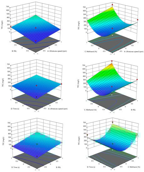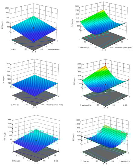 The surface response methodology is a statistical method used to depict the relationship between two parameters and the experimental data [26]. In our study, the Box–Benhken design was used for the optimization of the TPC and TFC extraction from amaranth seed flour using four parameters (ultra-turrax speed, solid-to-liquid ratio, methanol concentration and time). In Figure 2 and Figure 3, the evolution of the TPC and TFC as a function of the parameters studied are presented.