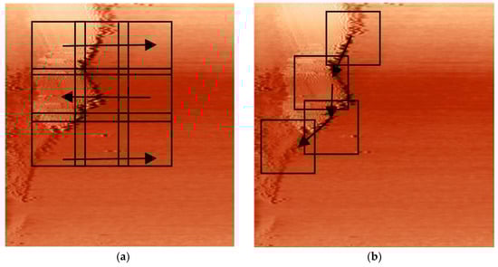 The uniform scanning of a studied area is sufficiently elaborated by the microscope and software manufacturers. In the present study, we turn our attention to tracking scans. Tracking scanning allows to significantly save the time of scanning. The amount of savings provided in [] amounted to up to 67% of the scanning time []. For example, in the case shown in Figure 1, the time savings is 5/9 or 55%. It should be noted that significant time savings are also achieved by automating the pre-processing of images and the selection of the trajectory of the displacement of the field of view, carried out by the experimenter manually.