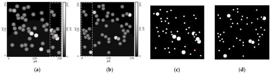 Figure 8 shows that the centres of several densely packed agglomerates, determined by the curvature detector, may not match the visually detected centres. This problem can be solved by increasing the image resolution or reducing the microscope field of view. The number of detected particles increases in proportion to their concentration if the image resolution is sufficient. Images of polystyrene spheres coated by gold (Figure 10), obtained from the scan gallery [], and Table 3 confirm this fact. The size of the image elements that can be detected should not be less than 4–5 pixels. This is illustrated by Figure 11 [], where some small elements, located at a short distance (4–5) pixels from other elements, were not detected.