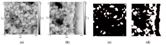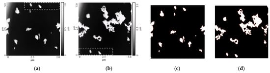 Overlapping test images (256 × 256 pixels, Z range—200, x-axis offset 190 pixels): (a,b) source images with marked overlap area; (c,d) the results of segmentation by GrainAnalysis.