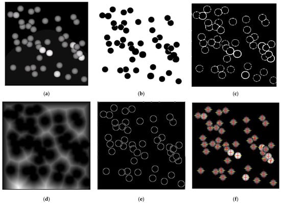Comparative results of the segmentation on test image: (a) the initialimage (the scale according to Figure 3a), containing 47 particles with a radius of 10 pixels; (b) segmentation by Otsu’s method; (c) segmentation with the use of the adaptive threshold technique; (d) segmentation by Watershed method; (e) segmentation by Canny method; (f) the centres of the particles, and the zones of maximum curvature, obtained using a curvature detector.