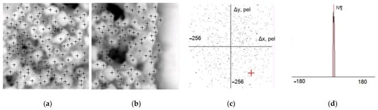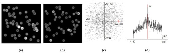 Results obtained by the IMBKPP method for the copper microparticles’ images: (a,b) source images with marked particle centres; (c) the map of displacement values; (d) the histogram of rotation angles.