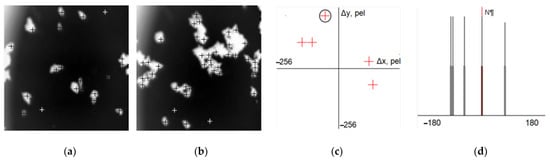 To compare the methods of particles monitoring on the complex images (Figure 4 and Figure 5), we use threshold segmentation performed using the Grain Analysis tool. The threshold was adjusted manually to the value at which the agglomerate particles in the overlap area are separated from each other. A comparison of the segmentation results with the GrainAnalysis tool (Figure 4 and Figure 5c,d) and the curvature detector (Figure 7, Figure 8 and Figure 9) shows that the detector highlights more key points in the overlap zone, which makes it easier to overlap images in coordinate coupling. Figure 7, Figure 8 and Figure 9a,b shows two overlapping images and the computed results for the displacement and rotation. The scale of the images (Figure 7, Figure 8 and Figure 9) corresponds to Figure 3, Figure 4 and Figure 5. The array M is displayed in the form of the two-dimensional map of the displacement values (Figure 7, Figure 8 and Figure 9c: dot designates a non-zero element of the array M, and cross designates a maximum) and the array N(φ) is shown in the form of a diagram (Figure 7, Figure 8 and Figure 9d). The orientation parameters Δx, Δy and φ are determined from the positions of the maxima of the M and N arrays.