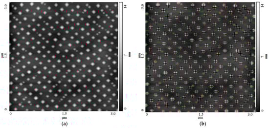 Array of ordered Ge(Si) pyramid islands, grown on relaxed SiGe buffer layer []: (a) source images 3 × 3 μm; (b) images with marked centres.